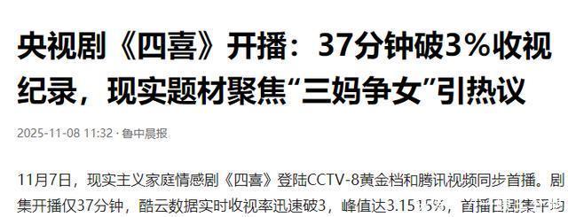 11月7日,开播仅37分钟,收视率便直接突破3%,成为央八史上第二个最快破3的剧集。 《四喜》能一开播就“爆火”,除了央视的加持,更离不开这部剧精彩的情节。